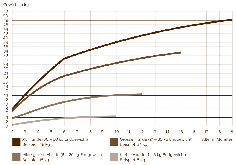 Grosse und Riesenrassen werden hingegen bis zu 100-mal schwerer: Ein Berner Sennenhundwelpe kommt mit rund 500 Gramm zur Welt und kann als ausgewachsener Hund stolze 50 kg erreichen. Dies lässt schon erahnen, dass besonders grosse Rassen auf ein gut entwickeltes, gesundes und stabiles Skelettsystem angewiesen sind. Gerade in der Entwicklung muss dieser Tatsache Rechnung getragen werden, und die Ernährung sollte den entsprechenden Bedürfnissen angepasst sein. Dies kann entweder durch die Ergänzung der herkömmlichen Nahrung für erwachsene Hunde oder durch spezielle Welpennahrung erfolgen.